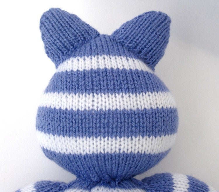 Mr. Cat is around 16 inches tall(the size of the toy depends on the size of the yarn and knitting needles as well as on how tightly you are knitting)